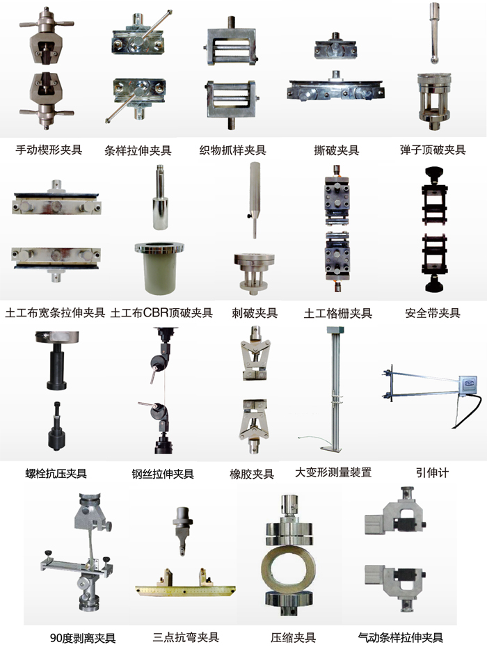 常見(jiàn)的拉力機(jī)夾具以及協(xié)助裝置如下: