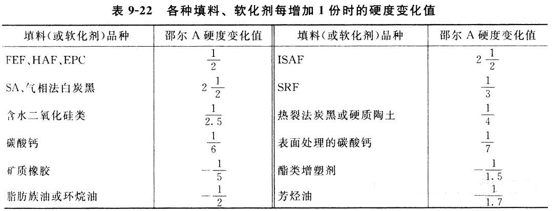 硫化膠硬度(預(yù)計(jì))=純膠的基本硬度+填料份數(shù)× 每增加1份填料的硬度的變化值-增塑劑份數(shù)× 每增加1份增塑劑的硬度的變化值