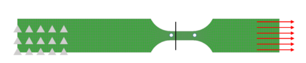 為驗證試驗數(shù)據(jù)和擬合獲取的真實應(yīng)力-塑性應(yīng)變曲線的有效性去突破,通過LS-DYNA軟件對試驗材料進行了有限元模擬仿真分析∵_到?紤]到材料模型對網(wǎng)格尺寸的敏感性智能設備,采用實體單元對試樣進行網(wǎng)格劃分,有限元模擬試件尺寸與實際試件相同(參見下圖)行業分類。參照試驗條件技術特點,試件左端固支,右端采用*BOUNDARY_PRESCRIBED_MOTION對試件加載(輸入速度-時間曲線)發展邏輯。通過在測量段設(shè)置橫截面*DATABASE_CROSS_SECTION_PLANE定義拉伸載荷輸出(下圖中黑實線)凝聚力量,同時在測量段兩端選取兩個節(jié)點(下圖測量段兩端的白色圓點),定義*DATABASE_HISTORY_NODE聽得進,通過計算這兩個點的相對位移獲得拉伸位移量新的力量,并將仿真獲得的載荷對位移曲線和試驗進行比對完成對標(biāo)。