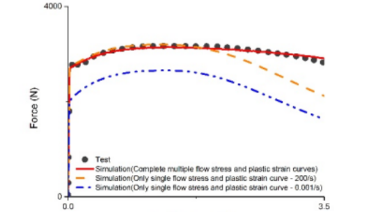 注:模型采用LS-DYNA 24號材料卡*MAT_PIECEWISE_LINEAR_PLASTICITY描述鋼材料力學(xué)特性便利性,使用*DEFINE_TABLE和*DEFINE_CURVE關(guān)鍵字輸入一組應(yīng)變率效應(yīng)流動應(yīng)力-塑性應(yīng)變曲線全面展示。